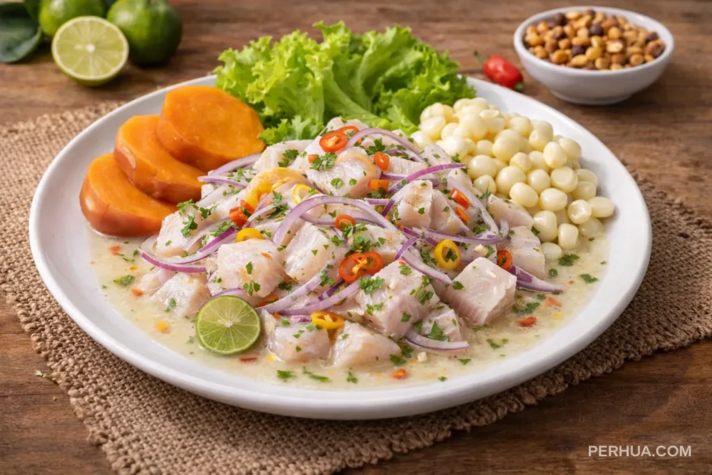 El ceviche peruano es el plato bandera del Perú y uno de los símbolos más representativos de su identidad gastronómica. Se prepara con pescado fresco, jugo de limón recién exprimido, ají limo, cebolla roja y sal. Su sabor es fresco, ácido y ligeramente picante, y se consume tradicionalmente al mediodía. En 2004 fue declarado Patrimonio Cultural de la Nación.